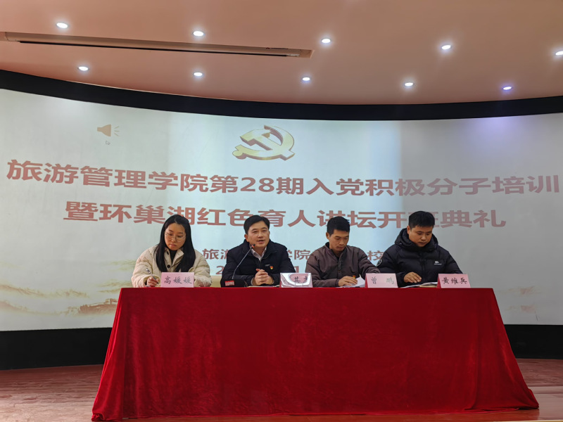 近日,旅游管理学院党委第28期党校暨环巢湖红色文化育人讲坛隆重开班。旅游学院党委副书记、纪委书记邓其志,学生支部书记曾鹏、黄维兵,新生辅导员高媛媛出席典礼,60名入党积极分子参加开班仪式。开班典礼由党校班主任曾鹏主持。